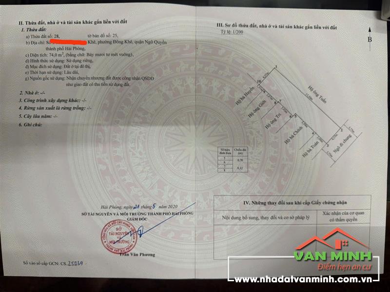 • Diện tích: 74m2 thực tế 77m2 ( Ngang 4,25m ) • cách mặt đường ĐÔNG KHÊ đúng 20m , ngõ rộng 2 ô tô tránh nhau, ô tô vào tận bếp .Ngõ Thông sang lô 27 Lê Hồng Phong, rất thích hợp để buôn bán , kinh doanh, xây vila • Hướng: đông nam