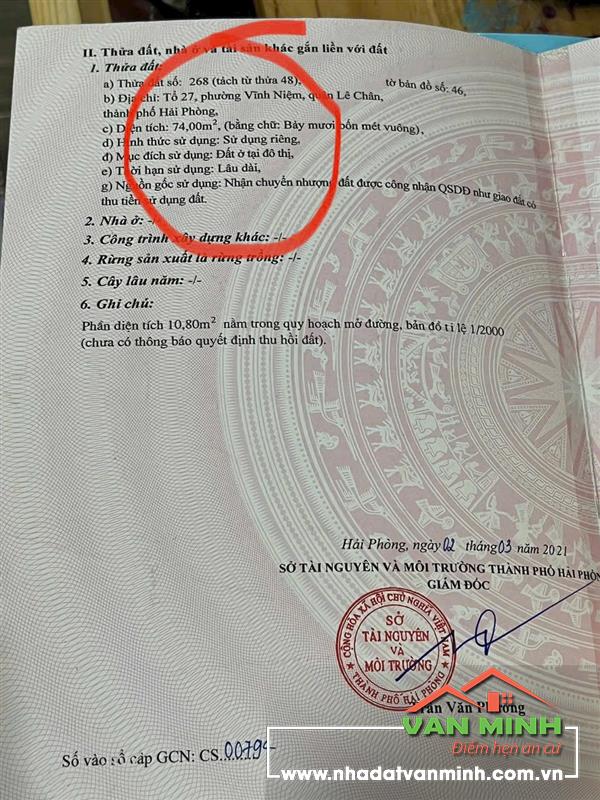 🆘 MỘT SẢN PHẨM ĐÁNG QUAN TÂM NHẤT LÚC NÀY - ĐẤT TẠI VĨNH TIẾN 2 THIÊN LÔI LÊ CHÂN HẢI PHÒNG Thông số: - Diện tích: 74m ngang 4m Vị trí: Cách đường Vĩnh Tiến 2 chỉ 40m, ngõ rộngb2,5m, ô tô đỗ sát đất. - Hướng: Tây tứ trạch Giá: 45tr/m thoả thuận chính chủ.